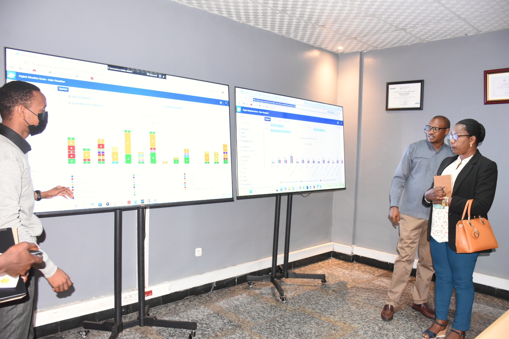 Nyuma yo gukanira n’Ubuyobozi bw’Akarere, beretswe icyumba ntangamakuru basobanurirwa imikorere n’imikoreshereze y’iki cyumba kibika amakuru mu buryo bw’ikoranabuhanga.